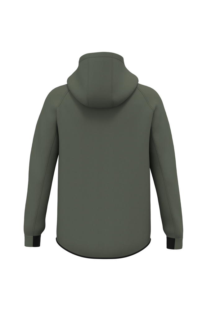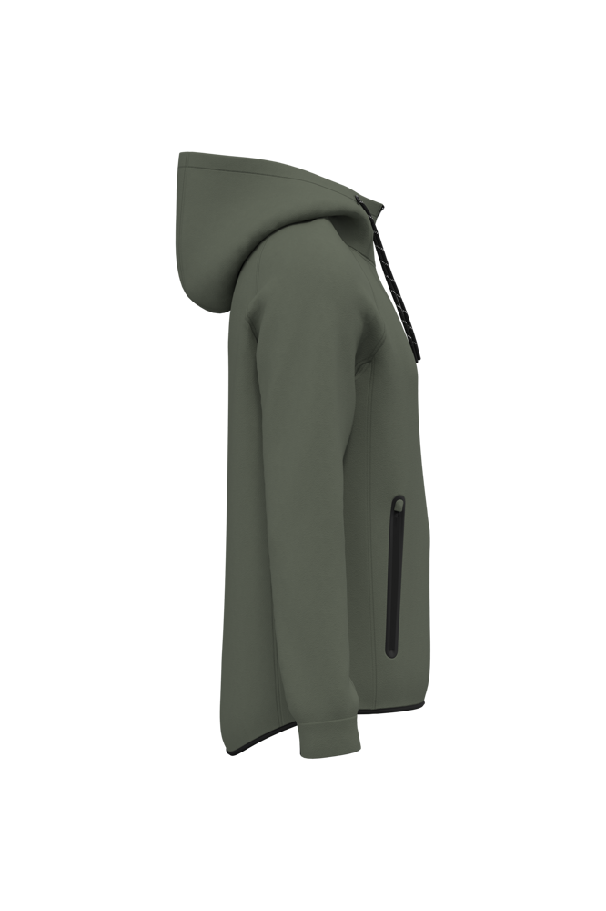 94% polyester / 6% elasthan. (Heather : 79% polyester / 15% viscose / 6% elasthan). Slim fit. Hele comfortabele stof. Ritssluiting. 2 ritszakken met warmtegelaste afwerking aan de voorkant. Capuchon met jerseyvoering van 65% polyester / 35% viscose met tweekleurige aanrijgkoordjes, afgewerkt met een plastic uiteinde. Nauwsluitende mouwuiteinden met een contrasterend, elastisch stuk. Onderkant kledingstuk afgewerkt met een contrasterende biaisband. Black op alle kleuren en Dark Grey op de Ash Heather (sluitingen ook).
