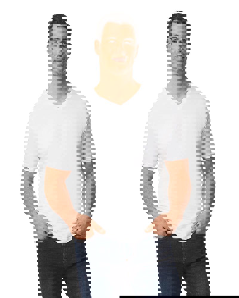 100% voorgekrompen ringgesponnen katoen (Sport grey: 90% katoen / 10% polyester). Jersey steek. Kraag in rib. Nektape van schouder tot schouder. Diepe V-hals. Europese maatvoering. Afgewerkt met dubbele stiksels. De stof is een kwartslag gedraaid om de middenvouw weg te werken.