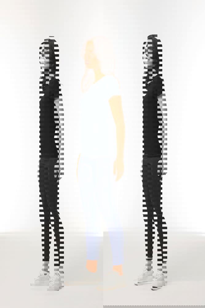 100% voorgekrompen katoen (Heather: 50% katoen / 50% polyester, Sport Grey: 90% katoen / 10% polyester). FNektape van schouder tot schouder. Korte vrouwelijke mouwen. Zijnaden en iets getailleerd. Dubbele stiksels aan de mouwen en onderaan.