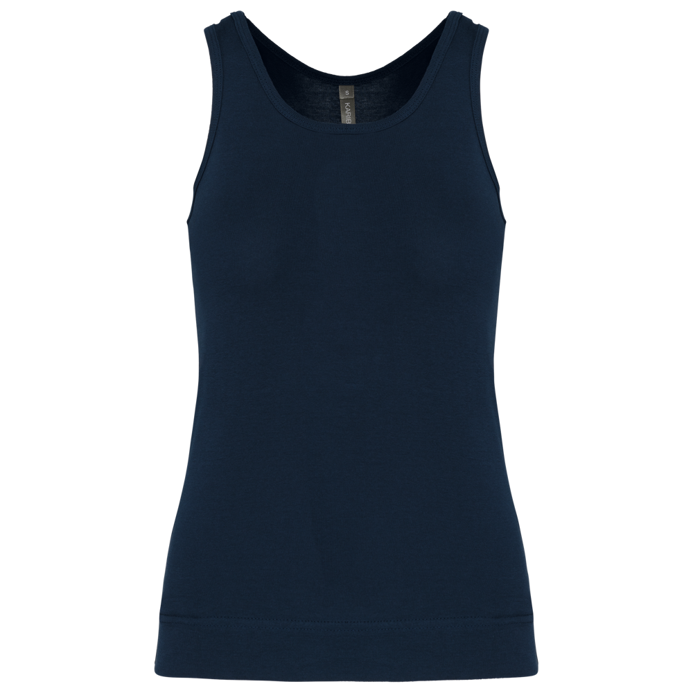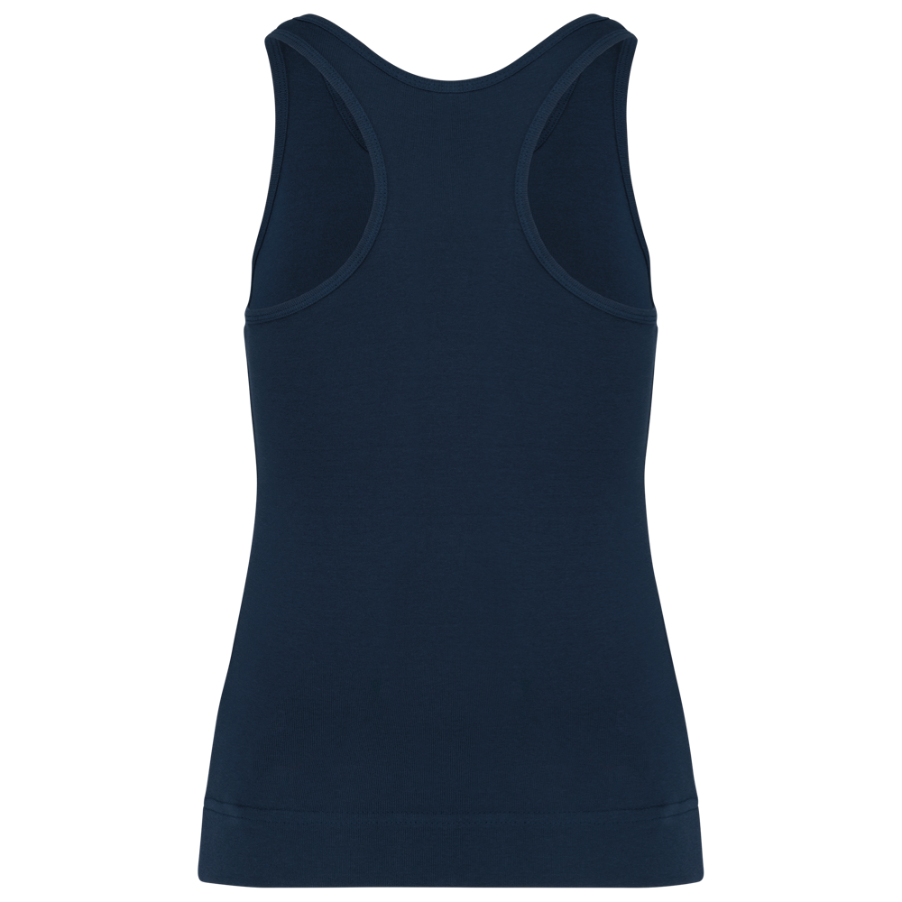 100% katoen 1x1 rib. Racerback. Afwerking met dubbele stiksels.