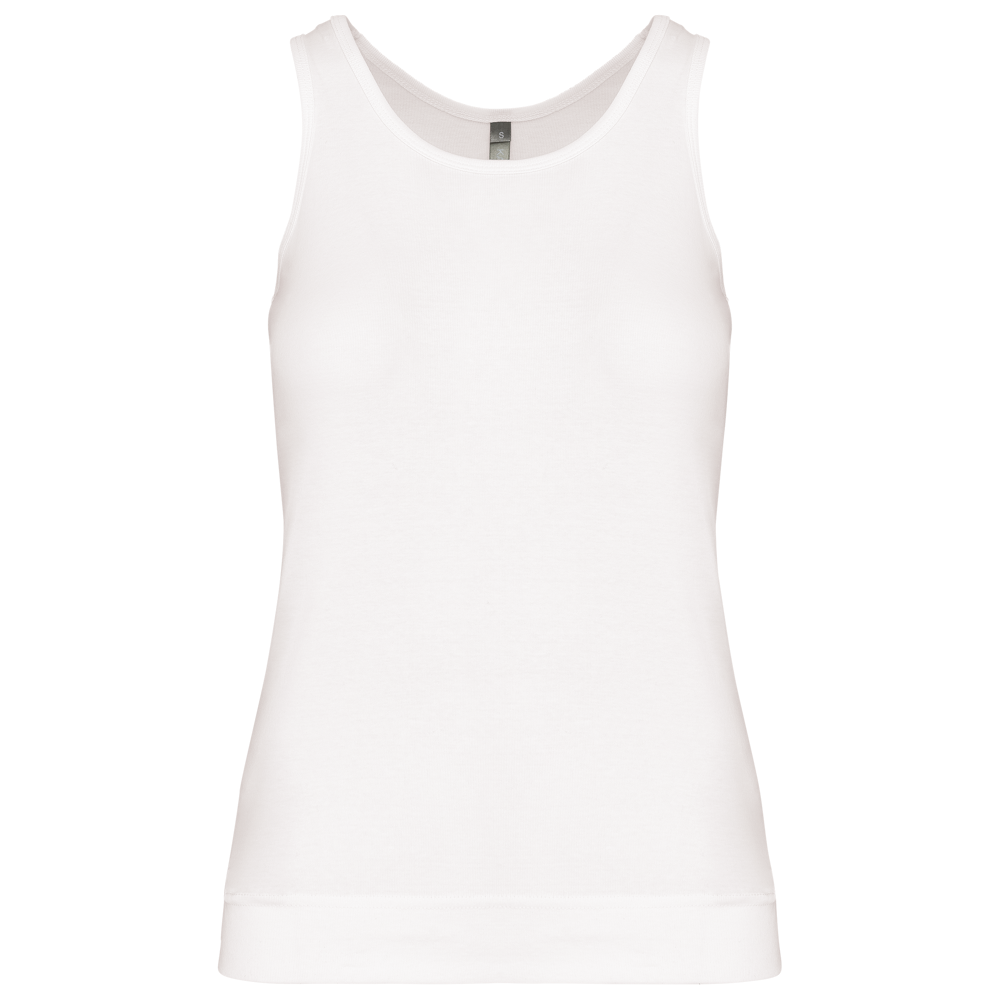 100% katoen 1x1 rib. Racerback. Afwerking met dubbele stiksels.