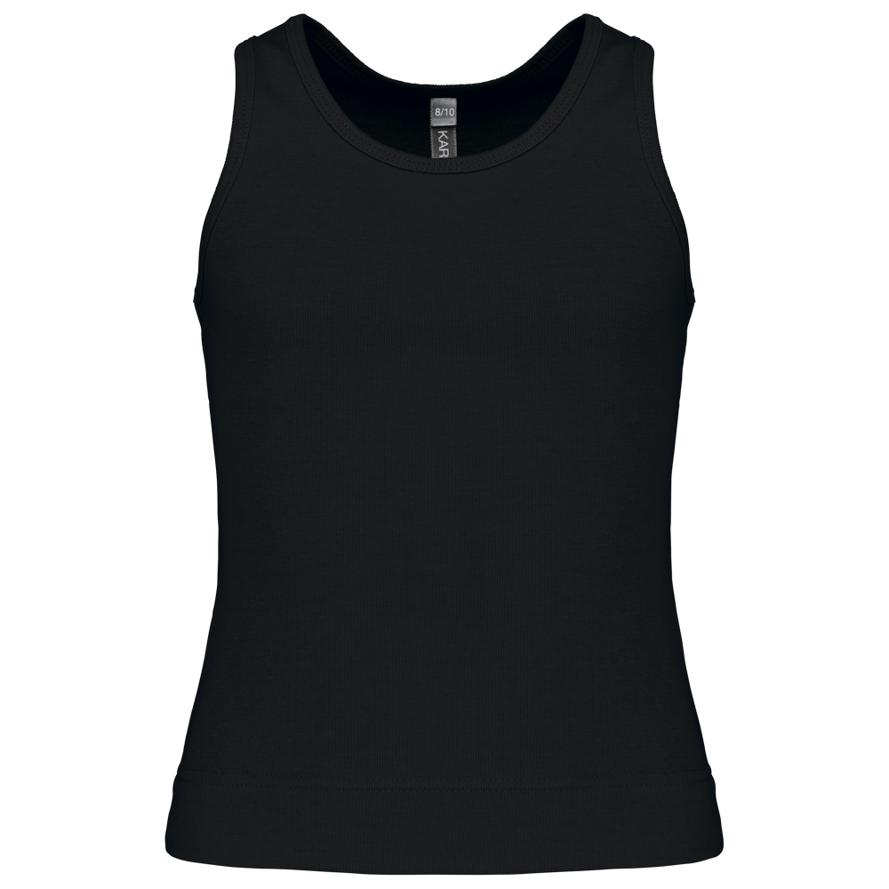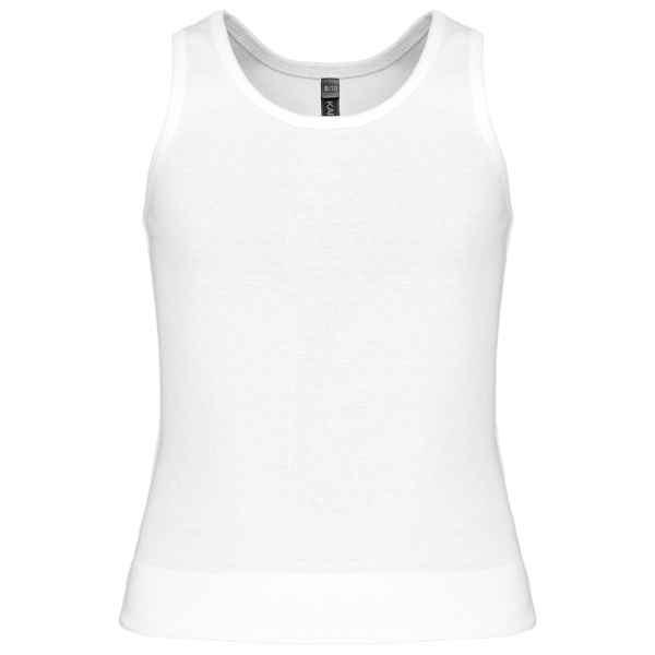100% katoen. 1x1 rib. Racerback. Afwerking met dubbele stiksels.