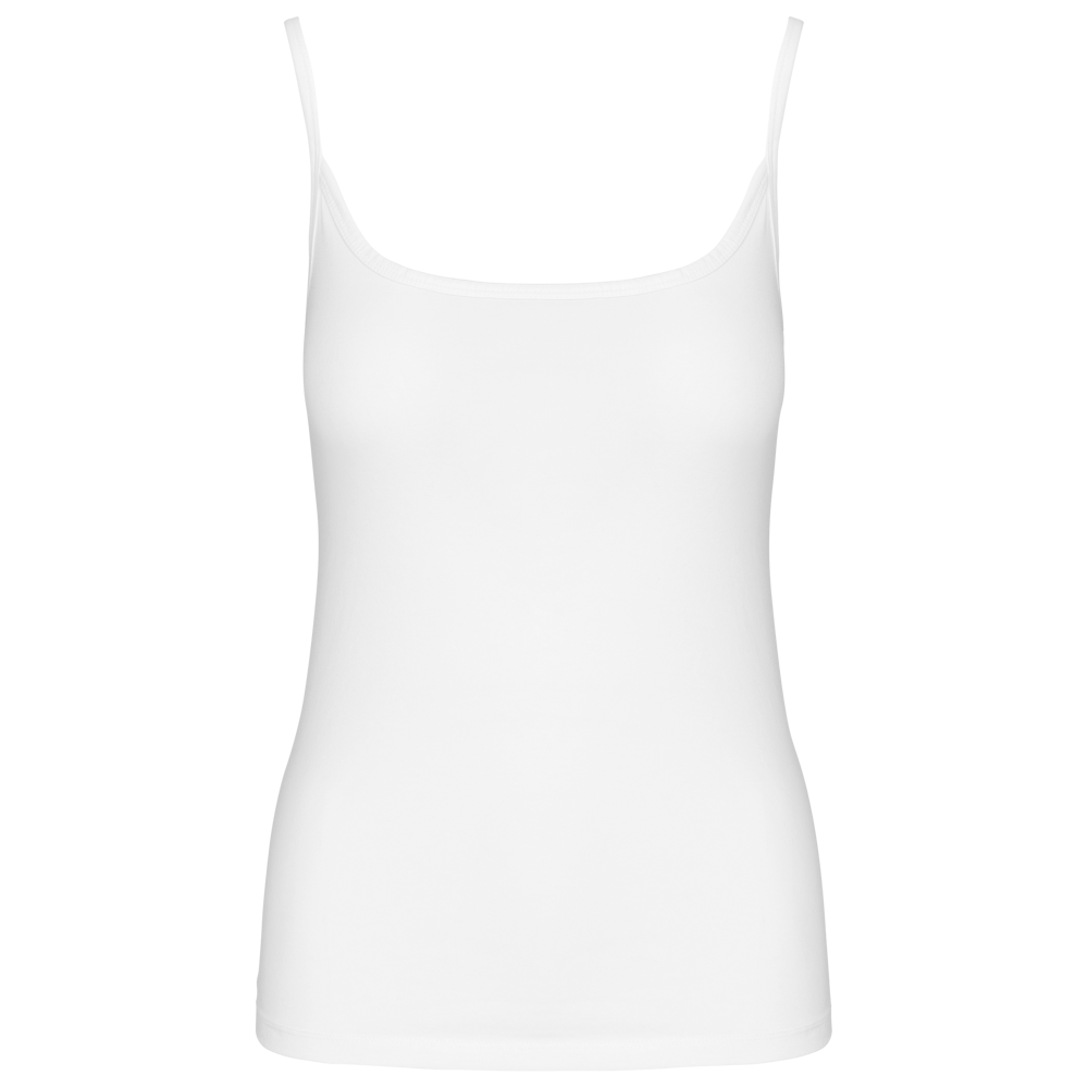 95% katoen / 5% elasthan. (Light Grey Heather : 87% katoen / 9% viscose / 4% elasthan). Gekamt katoen jersey. Dunne schouderbandjes en vrouwelijke pasvorm. Dun biesje aan de kraag en dubbel stiksel onderaan.