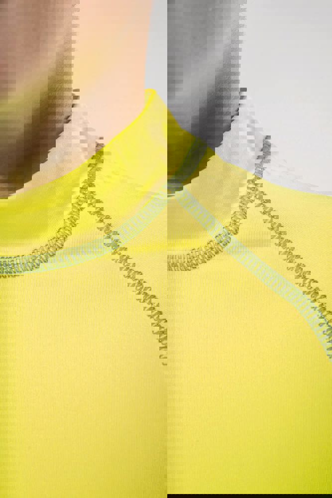 88% polyester / 12% elasthan. Stretchtricot. Bescherming UV 40+ in overeenstemming met de EN13758-1&2-norm. Korte mouwen. Opstaande kraag. Heel nauw aansluitende snit. Elastische gesp in de zoom vooraan om het koordje van de short door te steken en het T-shirt zo op zijn plaats te houden. Contrasterende stiksels. Mouwuiteinden en onderkant afgewerkt met dubbel stiksel.