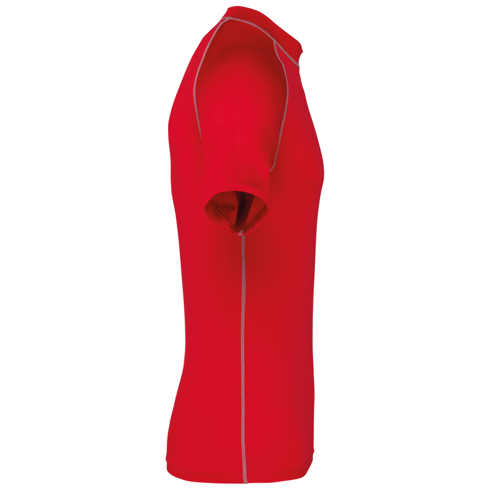 88% polyester / 12% elasthan. Stretchtricot. Bescherming UV 40+ in overeenstemming met de EN13758-1&2-norm. Korte mouwen. Opstaande kraag. Heel nauw aansluitende snit. Elastische gesp in de zoom vooraan om het koordje van de short door te steken en het T-shirt zo op zijn plaats te houden. Contrasterende stiksels. Mouwuiteinden en onderkant afgewerkt met dubbel stiksel.