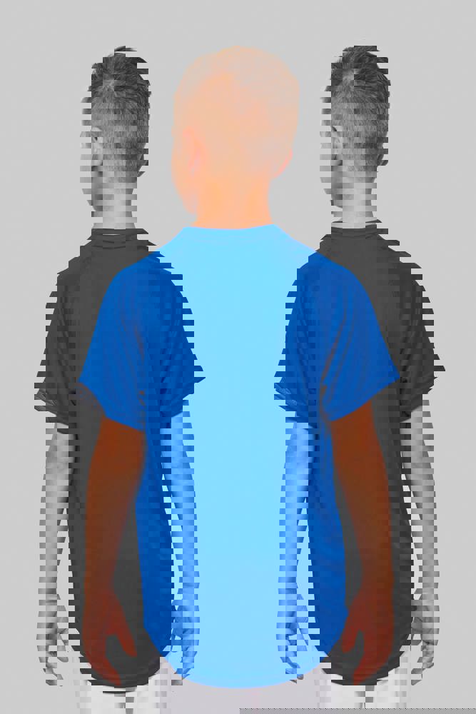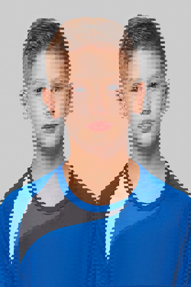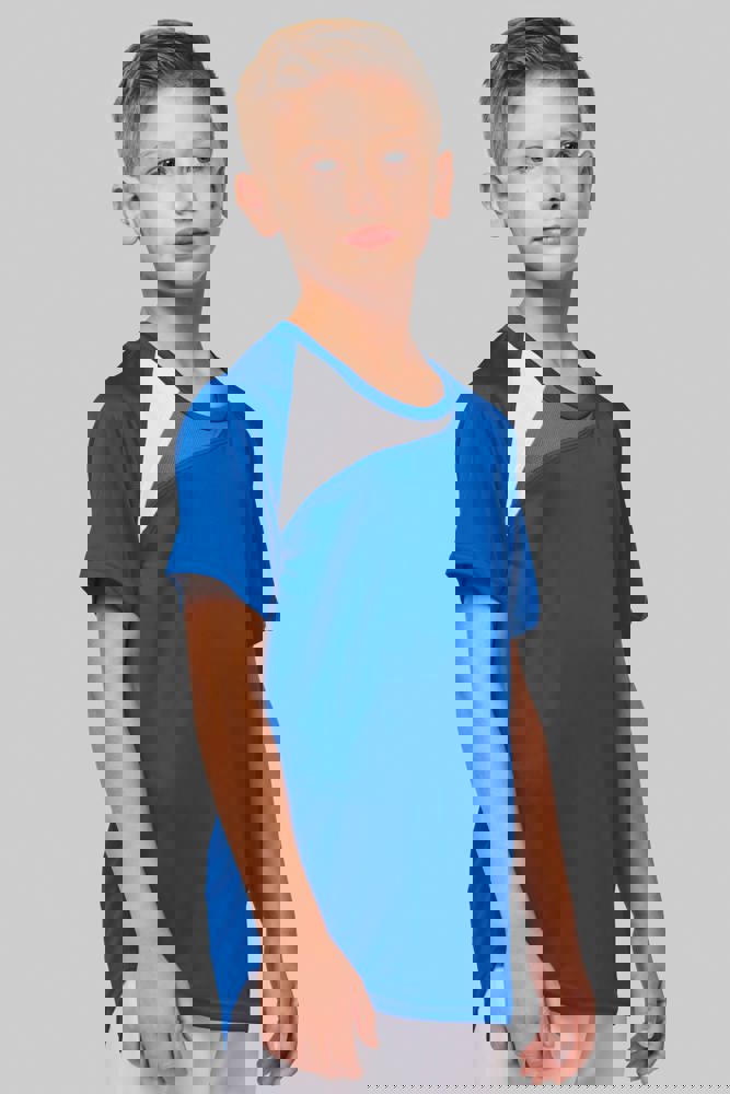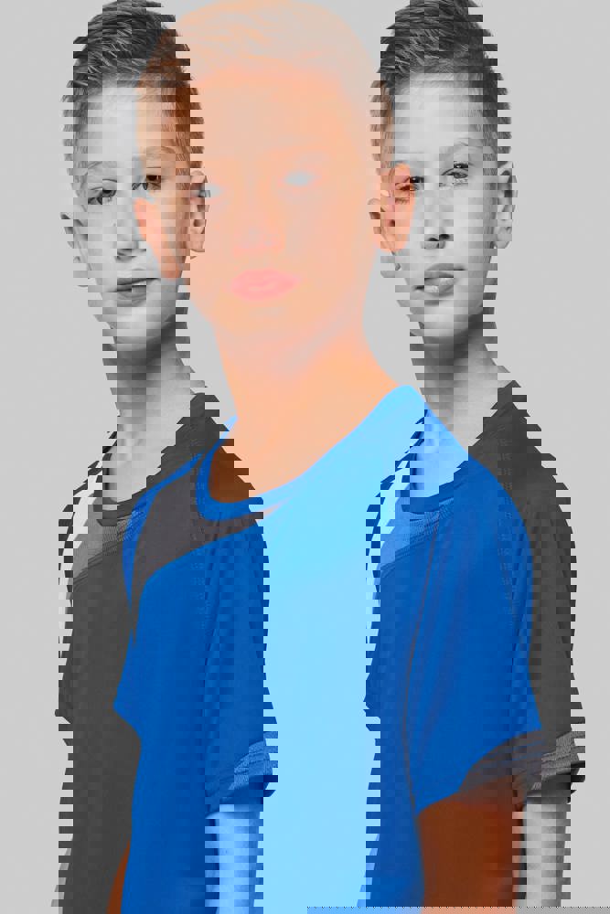 100% polyester. Inzetstukken in contrastkleur op de borst en mouwuiteinde. Overstiksels toon op toon. Afwerking met dubbele stiksels onderaan en aan de mouwuiteinden.