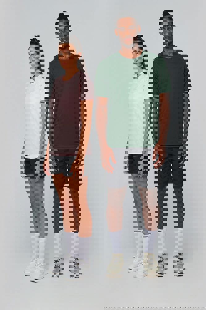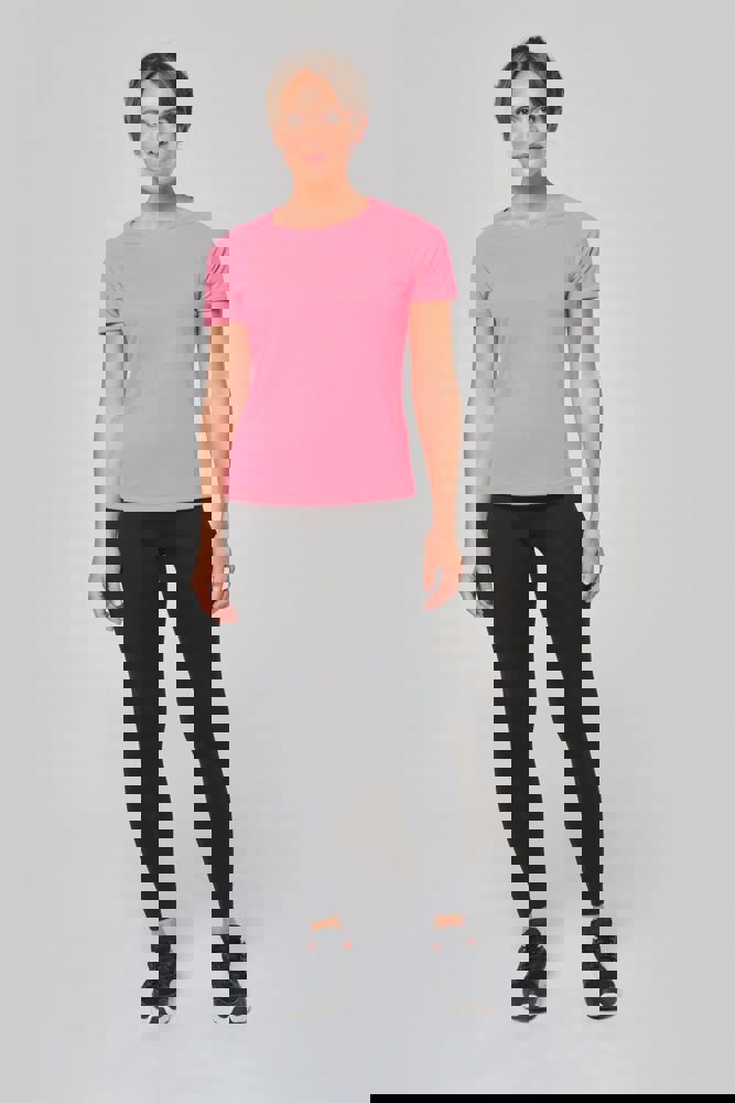 100% polyester. Sneldrogende lichte stof. Ronde hals. Nektape. Raglan mouwen met overstiksels. Afwerking met dubbele stiksels aan de mouwuiteinden en onderkant.