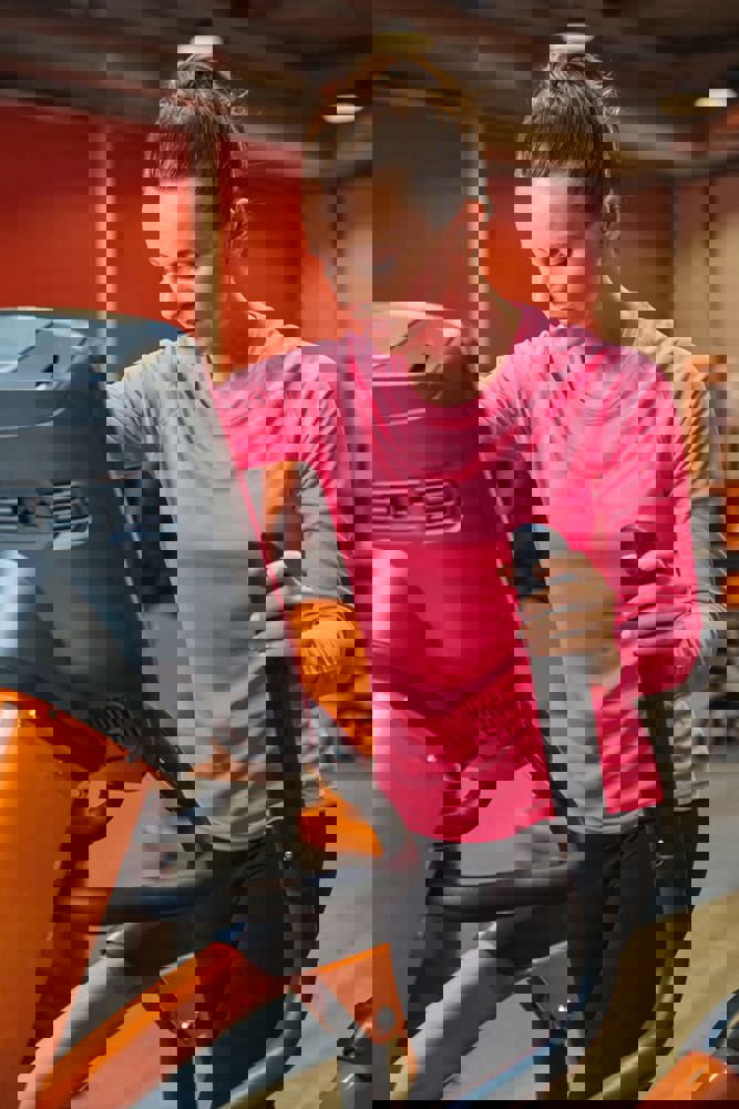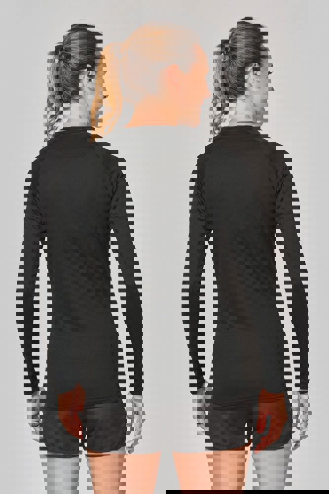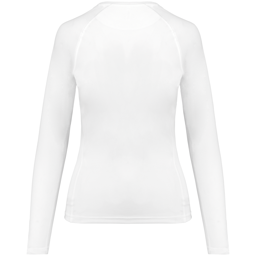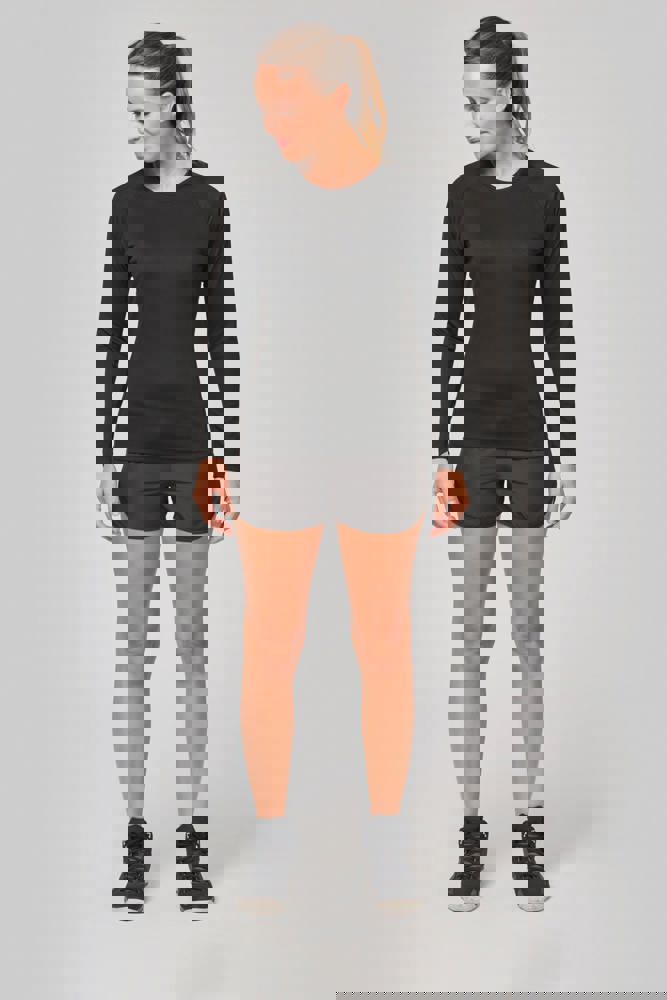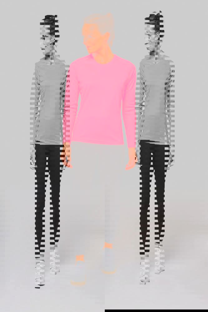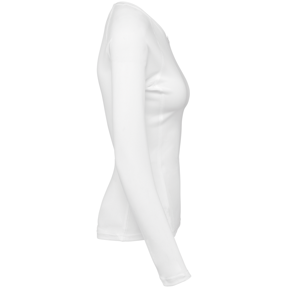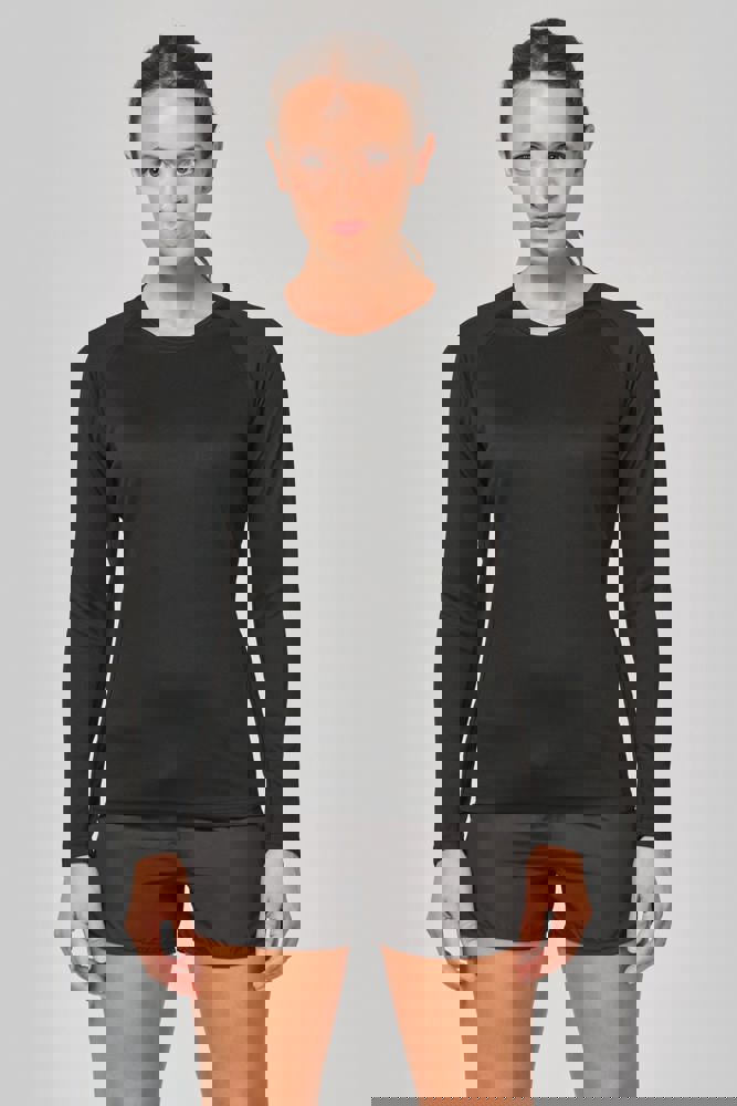 100% polyester. Sneldrogende lichte stof. Ronde hals. Nektape. Afwerking met dubbele stiksels aan de mouwuiteinden en onderkant.