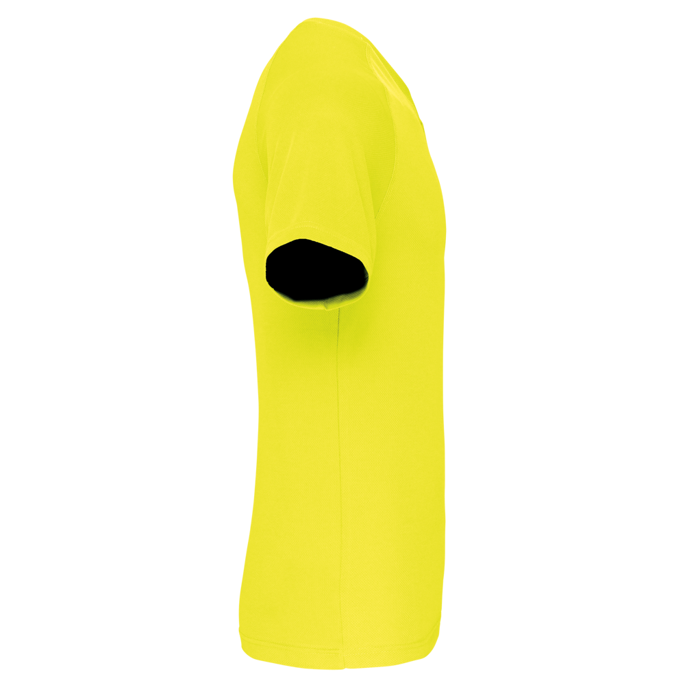 100% polyester. Sneldrogende stof. V-hals met nektape. Raglanmouwen met overlocksteek. Dubbel stiksel aan de mouwuiteinden en onderkant kledingstuk.