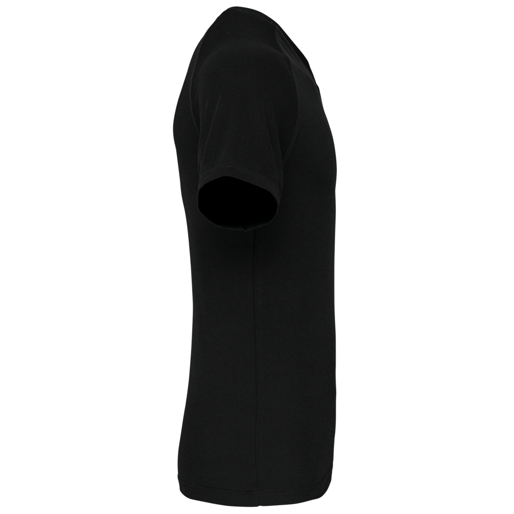 100% polyester. Sneldrogende stof. V-hals met nektape. Raglanmouwen met overlocksteek. Dubbel stiksel aan de mouwuiteinden en onderkant kledingstuk.