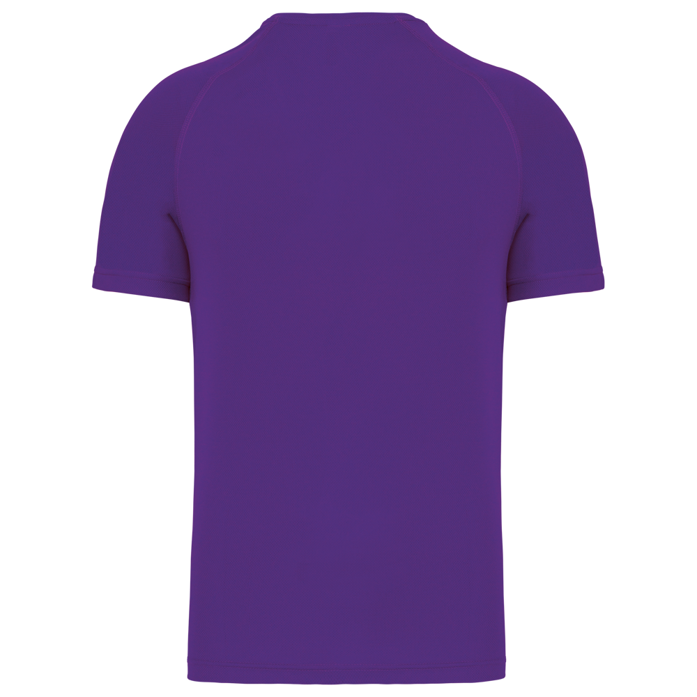 100% polyester. Sneldrogende stof. V-hals met nektape. Raglanmouwen met overlocksteek. Dubbel stiksel aan de mouwuiteinden en onderkant kledingstuk.