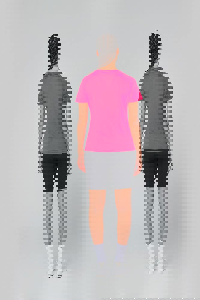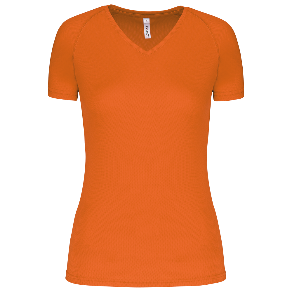 100% polyester. Sneldrogende stof. V-hals met nektape. Raglanmouwen met overlocksteek. Dubbel stiksel aan de mouwuiteinden en onderkant kledingstuk.