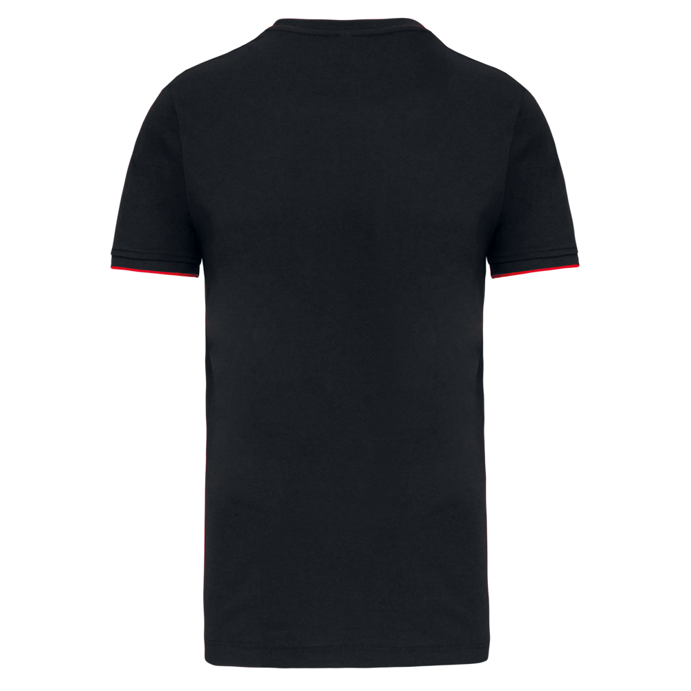 65% polyester / 35% katoen. Gekamd katoen jerseystof. Wasbaar op 60 °C. Anti-pluisbehandeling. Ronde hals met elasthan. Contrasterende bies aan binnenkant kraag en schouders. Mouwuiteinden in ribboord met contrasterend biesje. Afwerking met dubbel stiksel onderaan. Ideaal voor dagelijks gebruik.