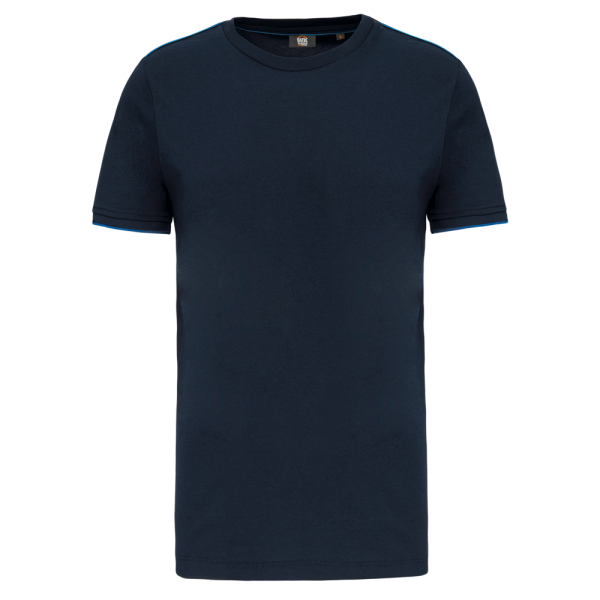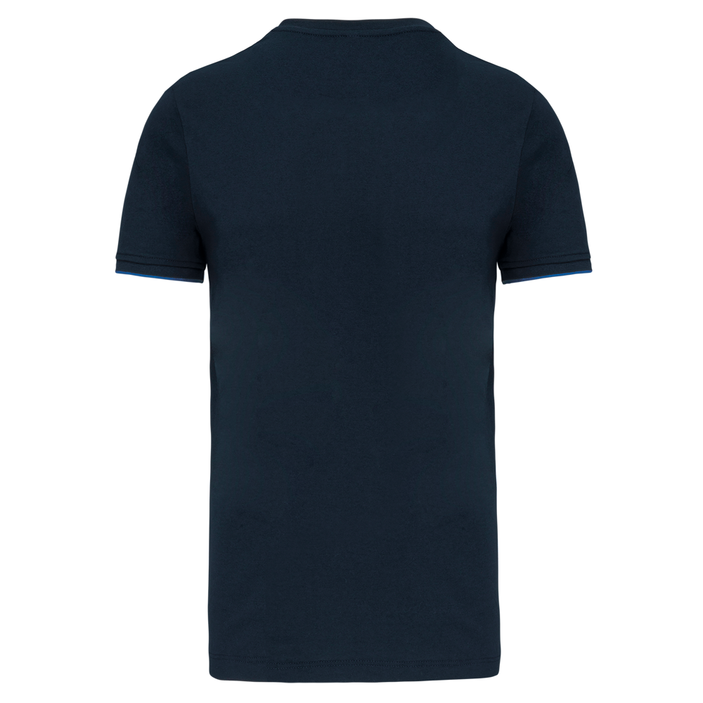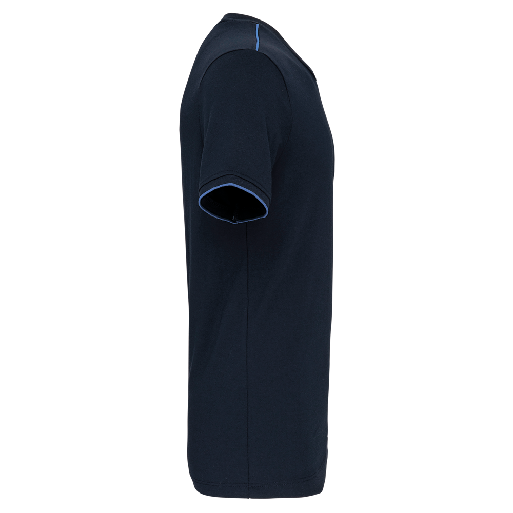 65% polyester / 35% katoen. Gekamd katoen jerseystof. Wasbaar op 60 °C. Anti-pluisbehandeling. Ronde hals met elasthan. Contrasterende bies aan binnenkant kraag en schouders. Mouwuiteinden in ribboord met contrasterend biesje. Afwerking met dubbel stiksel onderaan. Ideaal voor dagelijks gebruik.