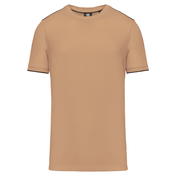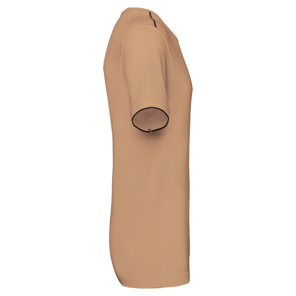65% polyester / 35% katoen. Gekamd katoen jerseystof. Wasbaar op 60 °C. Anti-pluisbehandeling. Ronde hals met elasthan. Contrasterende bies aan binnenkant kraag en schouders. Mouwuiteinden in ribboord met contrasterend biesje. Afwerking met dubbel stiksel onderaan. Ideaal voor dagelijks gebruik.