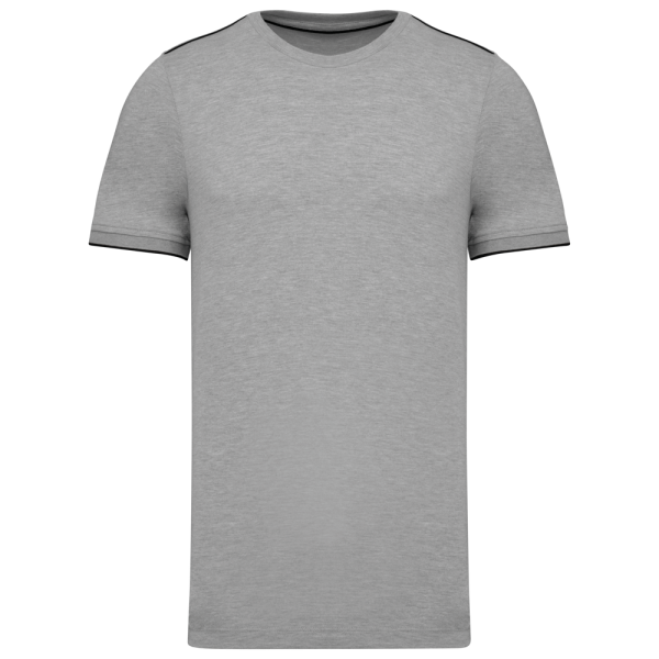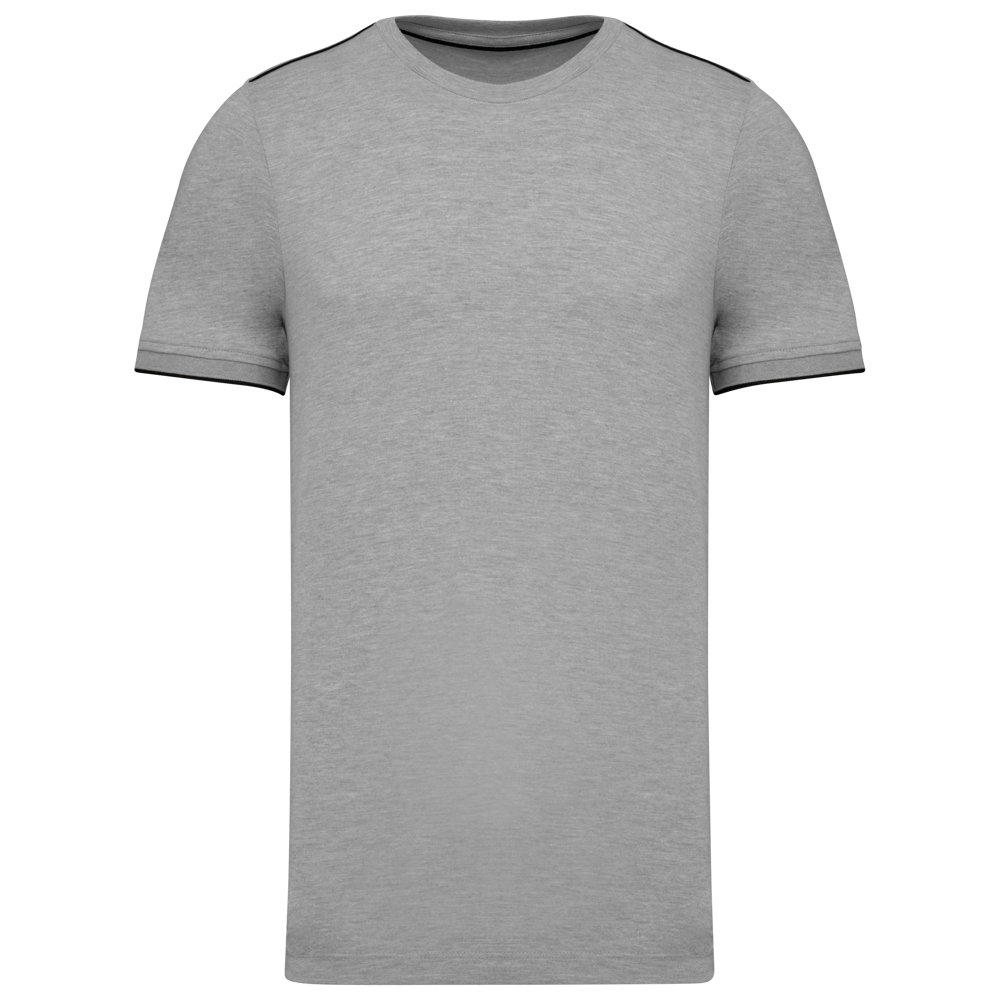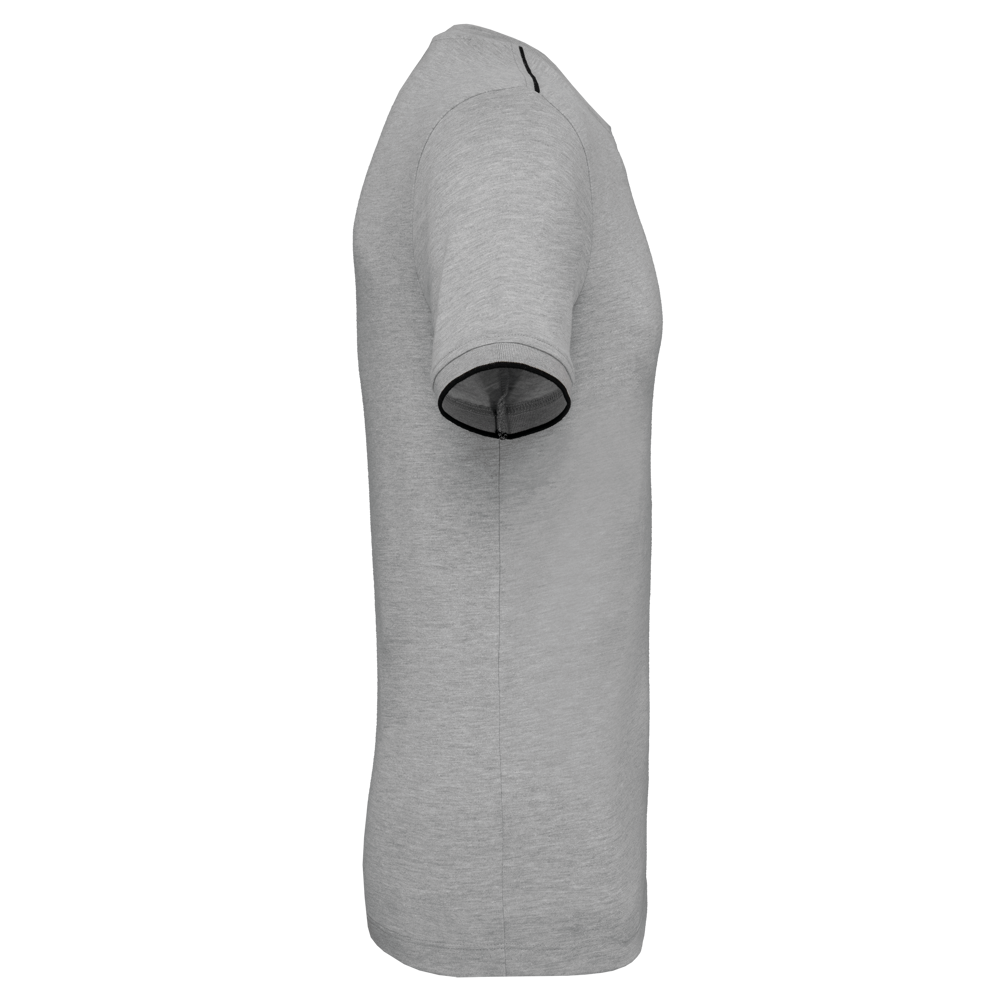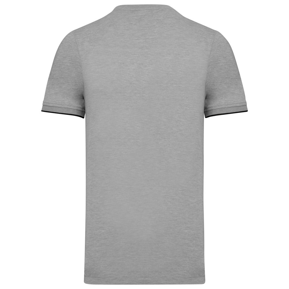 65% polyester / 35% katoen. Gekamd katoen jerseystof. Wasbaar op 60 °C. Anti-pluisbehandeling. Ronde hals met elasthan. Contrasterende bies aan binnenkant kraag en schouders. Mouwuiteinden in ribboord met contrasterend biesje. Afwerking met dubbel stiksel onderaan. Ideaal voor dagelijks gebruik.
