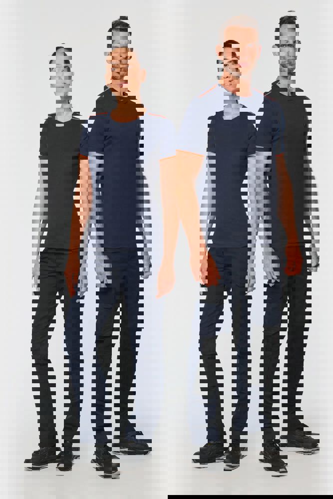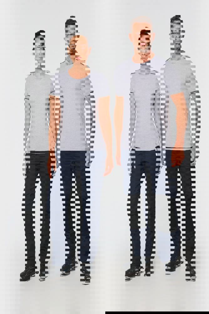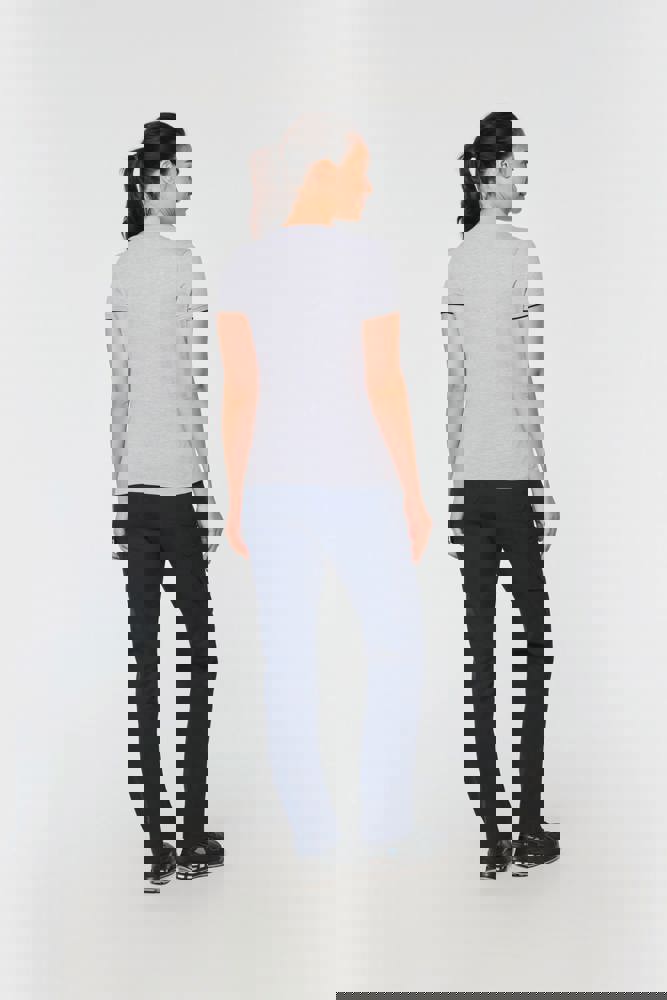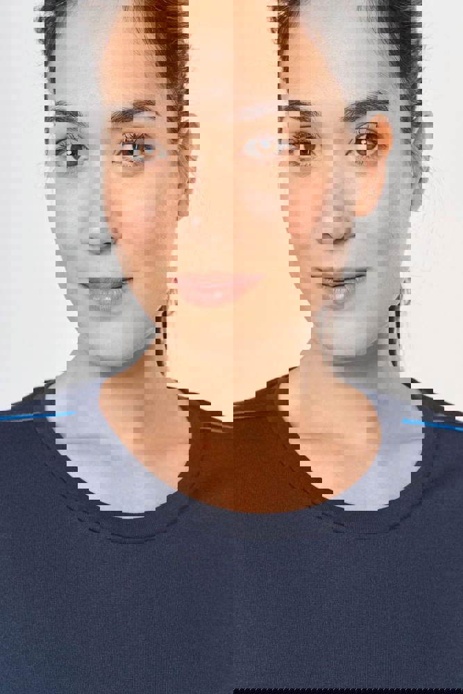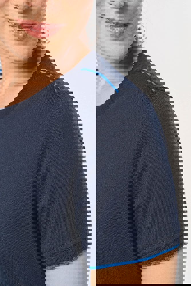 65% polyester / 35% katoen. Gekamd katoen jerseystof. Wasbaar op 60 °C. Anti-pluisbehandeling. Ronde hals met elasthan. Contrasterende bies aan binnenkant kraag en schouders. Mouwuiteinden in ribboord met contrasterend biesje. Afwerking met dubbel stiksel onderaan. Ideaal voor dagelijks gebruik.