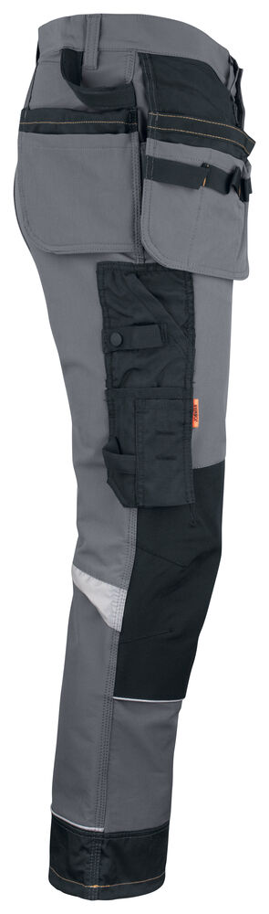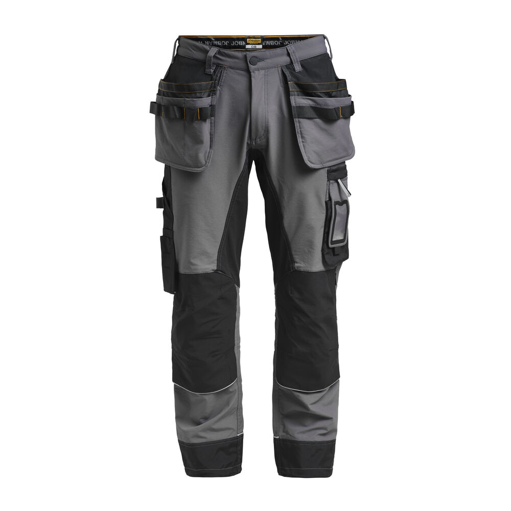 Geavanceerde broek in een zeer hoogwaardige en comfortabele 4-way stretch Ripstop kwaliteit gecombineerd met zeer slijtvaste polyamide en Cordura® versteviging voor extra duurzaamheid. De broek is voorzien van diverse zakken zoals een duimstokzak met mes-bevestigingsknoop, ruime verstevigde holsterzakken, deels loshangende achterzakken en een zak op het been met rits, telefoonvakje en ruimte voor een ID-kaart. Verder is de broek professioneel afgewerkt met een hamerlus, extra riemlussen bij de grote maten, siliconen in de band om het shirt op zijn plek te houden en reflecterend tape. De kniestukken kunnen op twee hoogtes worden geplaatst om de beste positie voor optimale bescherming te kunnen garanderen. De voorgevormde knieën en mesh in de knieholtes zorgen voor een optimaal draagcomfort. Gecertificeerd volgens EN 14404:2004+A1:2010 Type 2 Level 1 in combinatie met Jobman kneepads 9943, 9944 en 9946.