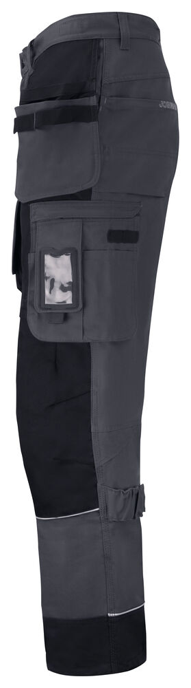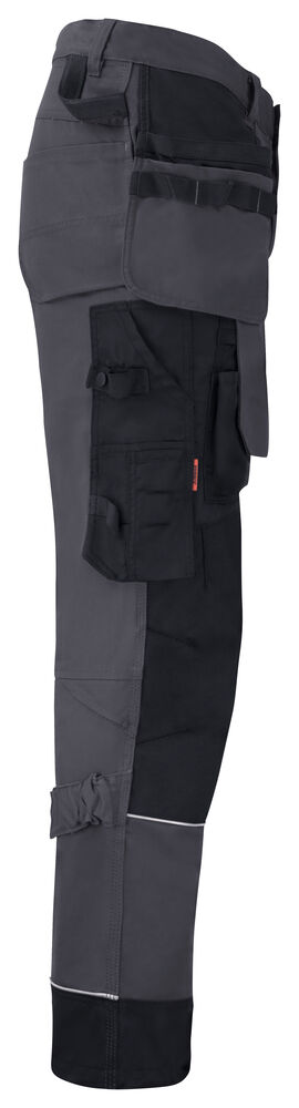Geavanceerde werkbroek speciaal ontwikkeld voor vloerenleggers. De broek is voorzien van diverse zakken zoals ruime holsterzakken die kunnen worden weggestopt in de steekzakken, verstevigde achterzakken, duimstokzak met ruimte voor een mes, zak op het been met rits, telefoonzak en ruimte voor een ID-kaart en dijbeenzak met ruimte voor vloerleggers messen. De broek is professioneel afgewerkt met een hamerlus, voorgevormde knieën, mesh bij de knieholtes en reflecterende details. Verder is de broek verstevigd met FA™ bij de dijen, polyamide bij de enkels en DuPont™Kevlar® bij de kniestukzakken.